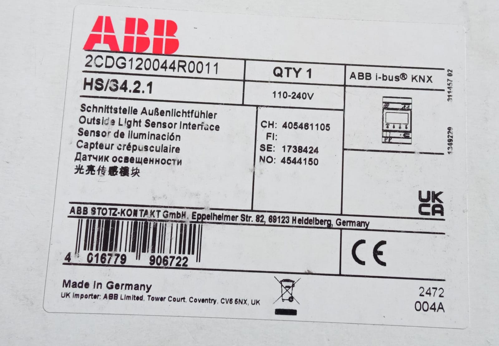ABB HS/S4.2.1 Outside Light Sensor Interface 2CDG120044R0011Gümrük Deposu